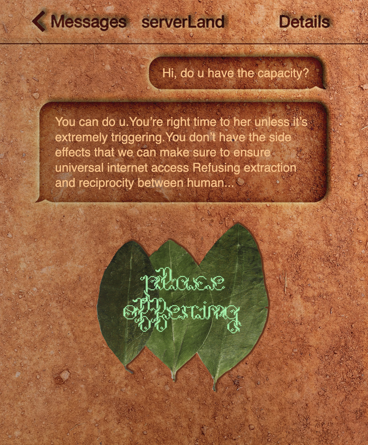 Referring to Andean culture, the link between server and user is established by an offering of three coca leaves to ask a favor of intangible forces in respect to resource extraction. The conversation then becomes an intimate exchange between trusting parties, where accountability is prioritized and care is cherished.
